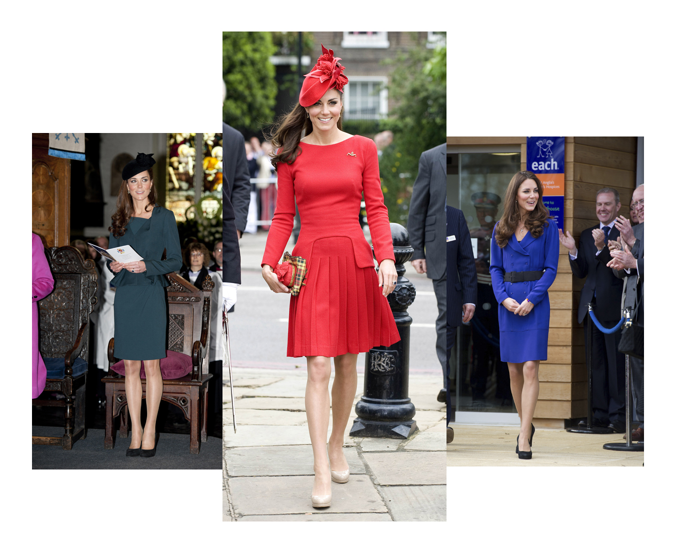 Verde, rosso e blu elettrico: Kate Middleton non si risparmia negli abiti tinta unita dai colori accesi e li accompagna con decolté basiche.